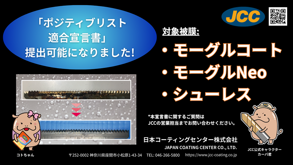 この度、JCCのモーグルコート、モーグルNeo、シューレスの「ポジティブリスト適合宣言書」の発行が可能となりましたのでお知らせします。詳細は下記アンケートフォームよりお問い合わせください。対象被膜: モーグルコート、モーグルNeo、シューレス