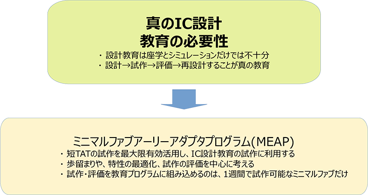 ミニマルファブCMOS ICを核とするエコシステムを構築し、少量多品種製品の開発を推進するために、ICを設計できる人材を大量に育成する。